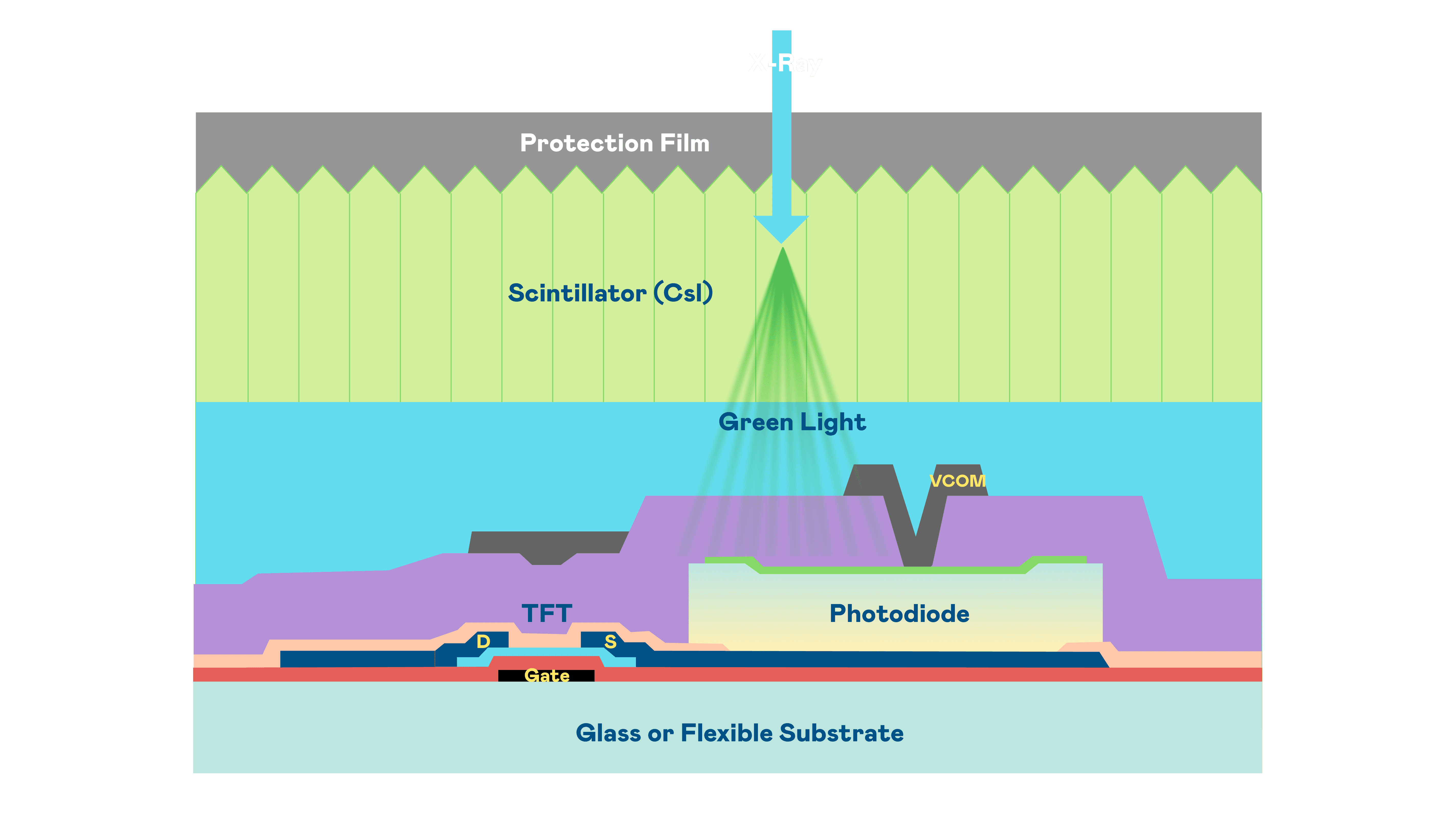 杏悦2的X光影像感测阵列使用薄膜电晶体 (TFT) 作为每个像素的读取开关,,,搭配光电二极体(Photodiode)的光电转换元件,,用以感测X光影像讯号。。